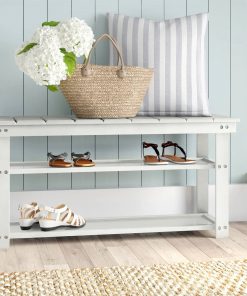 White Slatted Wood 2-Shelf Shoe Rack Storage Bench For Entryway or Closet