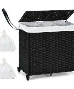 Black 3 Bin Linen Lined on Wheels PR Rattan Laundry Hamper