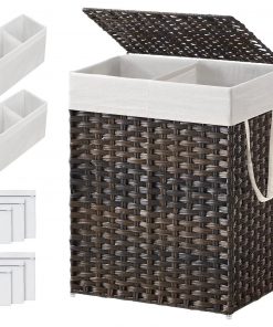 Brown PP Rattan 24-Gal Laundry Hamper Basket w/ 2-Compartment Washable Liner Bag