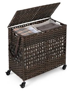 Brown PE Wicker Rattan 2 Section Rolling Laundry Hamper with Removeable Bags