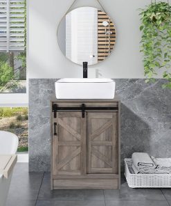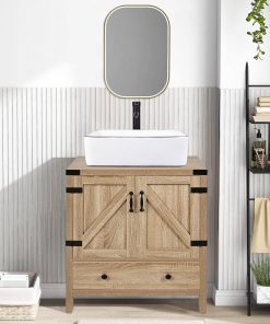 Farmhouse Wood Finish Bathroom Vanity with White Sink – Black Faucet and Drain