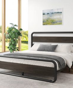 King Metal Platform Bed Frame with Mahogany Wood Panel Headboard Footboard