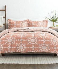 Full/Queen size 3-Piece Clay and White Reversible Floral Striped Comforter Set