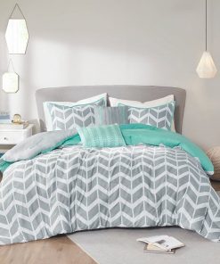 Full/Queen Reversible Comforter Set with Grey White Aqua Teal Chevron Pattern