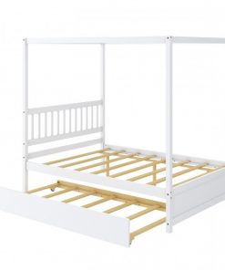 White Full Size Canopy Platform Bed with Twin Roller Trundle Bed