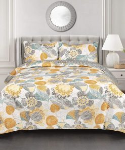 3 Piece Reversible Yellow Grey Floral Cotton Quilt Set in King Size