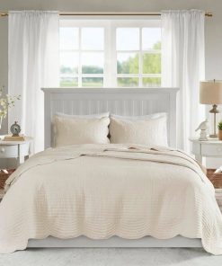 King Size 3 Piece Reversible Scalloped Edges Microfiber Quilt Set in Cream