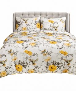 King size 3 Piece White Yellow Grey Reversible Floral Birds Cotton Quilt Set