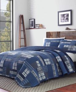 King size 100-Percent Cotton Reversible 3 Piece Blue Patchwork Quilt Set