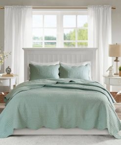 King Size 3 Piece Reversible Scalloped Edges Microfiber Quilt Set in Seafoam
