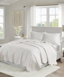 King Size 3 Piece Reversible Scalloped Edges Microfiber Quilt Set in White