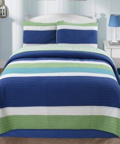Twin Size Navy Blue/Green/Teal/White Stripe 100-Percent Cotton Quilt Set