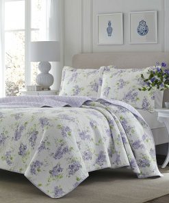 Full / Queen size 3-Piece Cotton Quilt Set with White Purple Floral Pattern