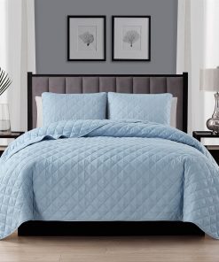 Full/Queen 3-Piece Light Blue Polyester Microfiber Reversible Diamond Quilt Set