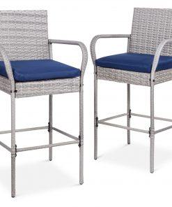 Set of 2 Grey Indoor/Outdoor Wicker Bar Stools w/ 2 Blue Cushions