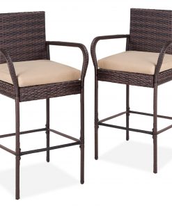 Set of 2 Brown Indoor/Outdoor Wicker Bar Stools w/ 2 Tan Cushions