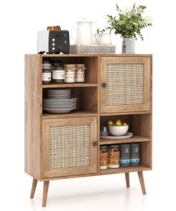 Mid-Century Modern Wood Sideboard Dining Buffet Storage Cabinet w/ Rattan Doors