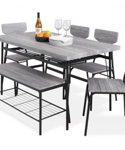 Modern 6-Piece Dining Set with Grey Wood Top Table 4 Chairs and Storage Bench