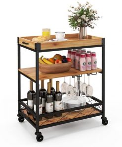 Modern Metal Wood Shelf Kitchen Serving Bar Cart with Removable Top Tray