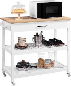 White Kitchen Microwave Cart with Butcher Block Top & Locking Casters