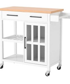White Kitchen Island Cart with Wood Top Storage Cabinet and Locking Casters