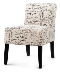 Modern Accent Chair Off-White French Cursive Pattern Upholstery with Black Wood Legs