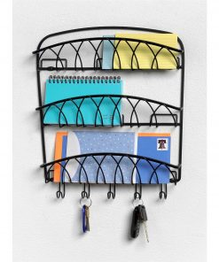 3-Tier Letter Holder Organizer with Key Hooks in Black Metal Finish