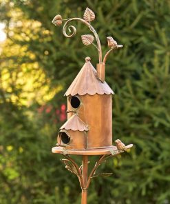 Copper Finish Metal Garden Birdhouse with Stake and Pole