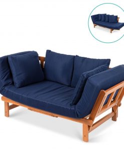 Navy Blue Outdoor Acacia Wood Convertible Sofa Futon with 4 Removable Pillows