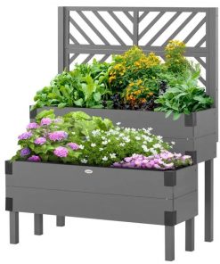 2 Tier Self Draining Grey Wood Raised Garden Bed Planter Box with Trellis