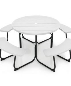 White Outdoor Metal and HDPE Picnic Table Bench Set with Umbrella Hole – Seats 8