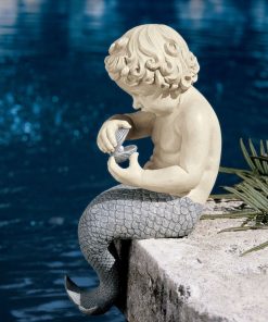 Young Little Sitting Mermaid Garden Statue with Oyster and Pearl