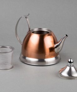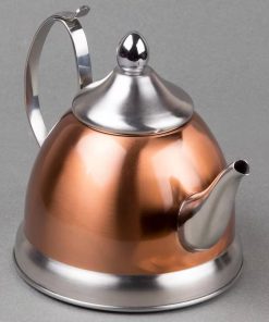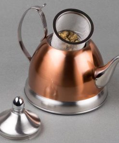 This 1 Quart Stainless Steel Teapot Kettle in Copper Finish with Tea Infuser is manufactured of finely brushed stainless steel with a unique royal design that will look good in any style kitchen setting. It comes with a removable stainless steel tea infuser so that you can brew your favorite blend of fresh tea leaves. An aluminum encapsulated bottom boosts the heat conductivity by evenly distributing it. Any stove top will welcome this classic design. Can be used as drip, pour over coffee kettle as well.