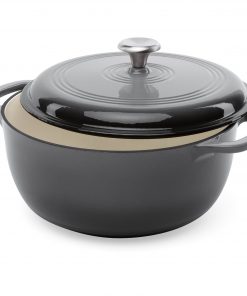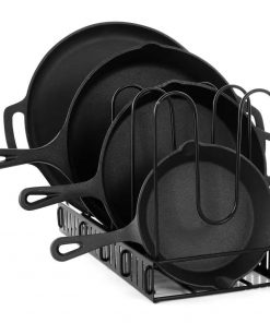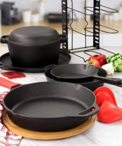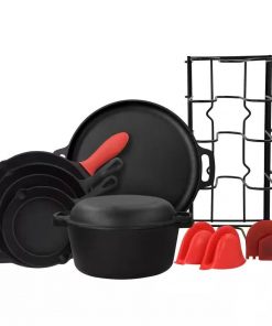 The 12-Piece Cast Iron Cookware set with Dutch Oven Frying Pan Skillet and Pizza Pan comes with all your cooking essentials, from storage to frying pans. Cast iron construction provides the most even heat distribution for improved cooking, frying, sauteing, baking, grilling, broiling, braising and more! This essential cast iron set comes with three frying pans of varied sizes, one dutch oven with lid that can be turned over and used as an additional fry pan, two silicone grips, two scrapers, one silicone handle cover, and one storage organizer. Each piece comes pre-seasoned to prevent any rust while in storage and for immediate use. The continuous baking-in of oils make for an increasingly non-stick finish will provide extra layers of strength to make this cookware last a lifetime. Silicone mits provide safe handling while pans are hot. Scrapers make cleaning a breeze and can also be used to assist in baking, cooking, or scrubbing. Quality metal rack provides storage options, place right in your cabinet or use to add countertop storage to your kitchen.