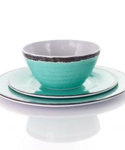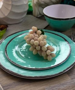 Brighten up the dinner table with the 12-Piece Melamine Plates Bowls Dinnerware Set in Turquoise Blue – Service for 4. Its unique crackle pattern in vibrant turquoise splashes color into the room while the black lined rim helps frame the meal. The lightweight melamine is durably made to be shatter resistant and chip resistant while being practically weightless. This set is top rack dishwasher safe for easy cleaning, and it is recommended to not microwave the plates. Bring out the set for special occasions, from birthday parties to backyard barbecues!