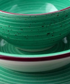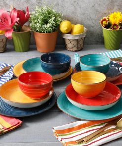 This beautiful 12-piece dinnerware set features 4-assorted colors – red, blue, green, and yellow. Unique speckled finish that brings style to any table. This versatile dish set comes with two sets of bowls so you can serve nearly any type of dish in them. All items are made of durable stoneware. This plate and bowl set features service for four.