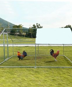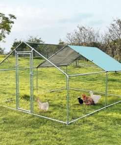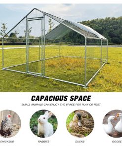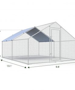 Farmhouse 13-ft x 10-ft Metal Wire Mesh Chicken Coop Run Pen Outdoor with Waterproof Cover. Durable metal chicken coop made of a high-quality stainless steel pipe frame using modern galvanizing technology. Perfect backyard cage for chickens, rabbits, ducks, geese. Durable and fit for outdoor use. There is no need to worry about rust. Includes a waterproof UV Cover made of 210-D UV-resistant Oxford cloth to protect your chickens from bad weather. A-frame peak roof design can effectively prevent rain, snow or debris accumulation on the roof. The wall of the chicken coop is made of PVC coated hexagonal wire mesh, It ensures that the poultry will not escape from the coop, while the small gaps between meshes add some safety to your poultry and prevent them from some predators.
