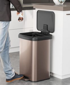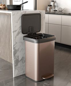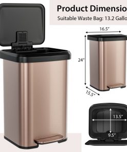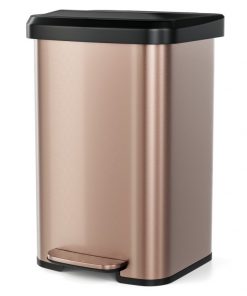 This 13-Gallon Copper Gold Stainless Steel Step Trash Can with Soft Close Lid would be a great addition to your home. Large capacity of 13 gallon is ample for home, office, shop, etc. Silent close lid features a damper design for gentle closing. Offers stay open function & spacious opening range. Built-in deodorizer compartment to get rid of unpleasant smells. Made of stainless steel to resist rust, deformations & fingerprints. Flip-up waste bag ring to keep garbage bags in place. Back handle to make movement much more effortless. Wide pedal is made of stainless steel for a longer lifespan. Anti-slip foot pads to protect the floor from being scratched. Smooth surface is easy to clean for daily maintenance. Needs no installation, saving you much time & effort.