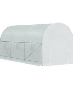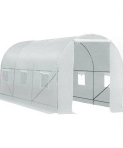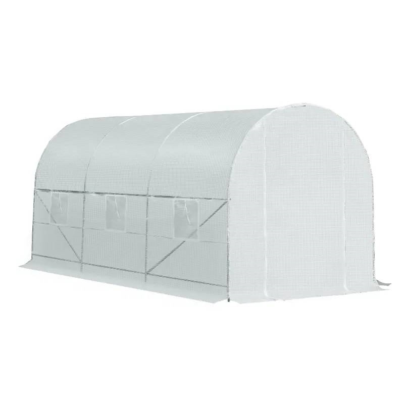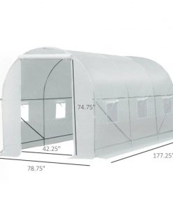 This 14.7 Ft x 6.5 Ft Outdoor Greenhouse w/ Heavy Duty Steel Frame and White PE Cover is an ideal way to extend your growing season while easily managing your plants and protecting them from extreme temperatures. Our two-layer 140 GSM PE cover features a reinforcement grid through the middle to prevent tearing. It protects plants from UV scorching while allowing 85% of nourishing sunlight to pass through uninterrupted. The 5.9 in extended edges are supposed to be deep buried in the soil to tighten the greenhouse cover for more stability and against rainwater accumulation. The galvanized steel frame of the walk in greenhouses for outdoors is fights against corrosion, chipping, and peeling. The greenhouse for outdoor has four slant supporting rods, four guy ropes, and four ground stakes for more stability. The zippered roll-up door of the patio greenhouse can be opened fully for easy access to this hoop house. The 6 mesh windows provide better air circulation for plants while also being observation windows to observe the growth of plants. Overall Dimensions: 14.6’L x 6.6’W x 6.6’H. Assembly Required.