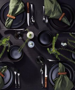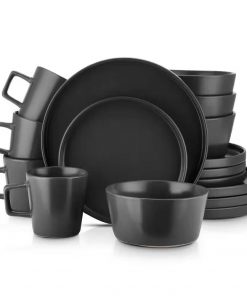 - 16 Piece dinnerware set – stoneware is hip, cool and trendy. Especially in a fashionable Black Matte. These sets of dishes make a statement.