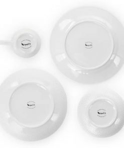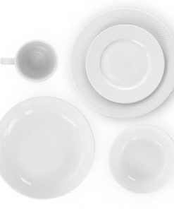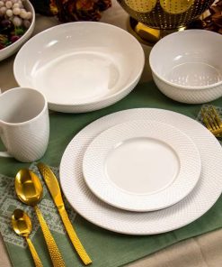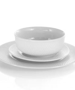 Enhance the table space with the 18-Piece White Porcelain Dinnerware Set with Plates Bowls Mugs – Service for 4. Featuring a stunning embossed diamond pattern along the exterior of each dinner plate and bowl. The dinnerware set only proves to upscale simplicity. Made from a durable Porcelain construction, the material helps meals retain heat longer. Guests can enjoy your best cuisines at their own pace without fear. For complete convenience the set is dishwasher safe for easy cleaning and microwave safe for fast reheating. Relish in the moment as snacks, entrees, soups, desserts and more are served.