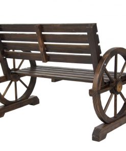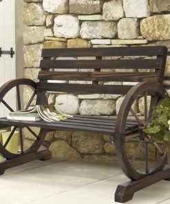 Seats taken!! Come rest your bones on the 2 Person Farm Home Wagon Wheel Wooden Bench. Crafted of solid fir wood with a dark brown finish, this durable bench is built to be a lasting cornerstone for your outdoor living. This 2-person bench adds a touch of country charm to your backyard or garden with its elegant, rustic design, great for your farm or barn. The bench’s curved armrests offer an eye-catching silhouette that provides comfortable lounging for you and a guest. Its lightweight design allows for easy portability, letting you to move this bench around for a change of scenery without the hassle.