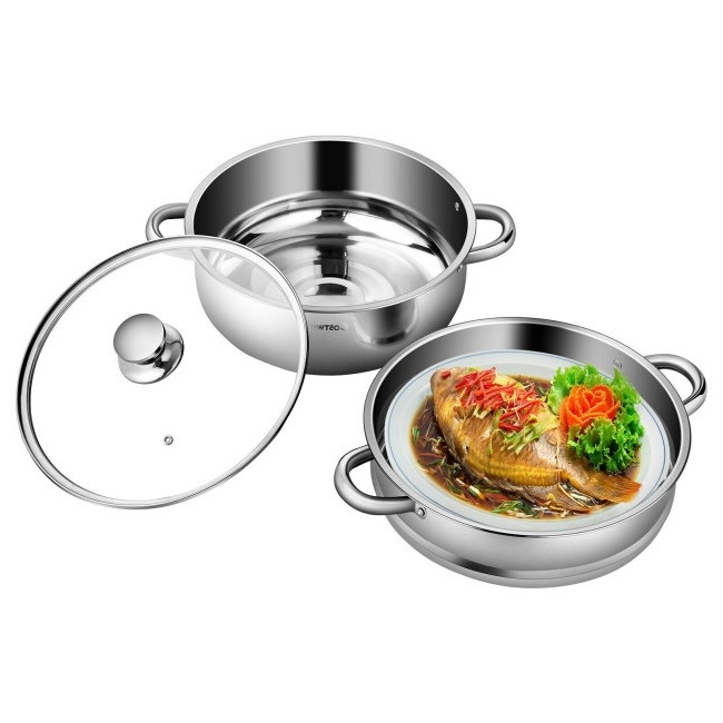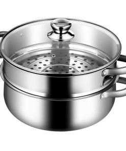 The steamer cookware set strikes a perfect balance between high steam efficiency and 360° cyclic orientation. It comes with a 5.3 qt sauce pot and a 4.2 qt steamer insert that makes the simultaneous cooking and steaming come true. The tempered glass lid included features good seal to retain the flavor of food. Transparent glass also enables a clear observation of cooking food. It is equipped with a steam outlet, designed to discharge the heat and thus relieve the pressure. Riveted handles on the lids and both sides of the pot body are user friendly, for convenient control.