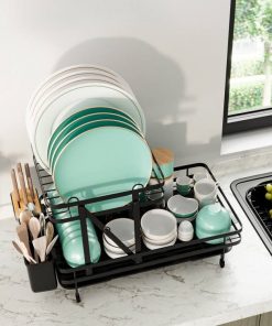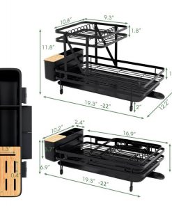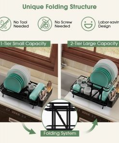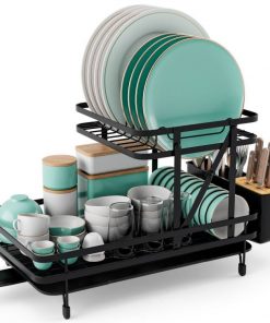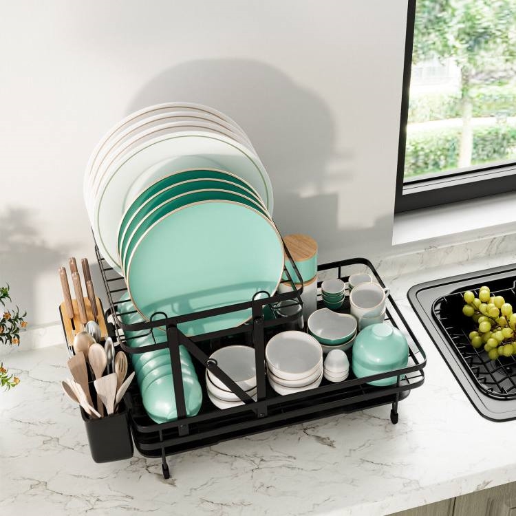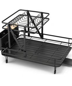 This 2 Tier Black Foldable Dish Rack Removable Drip Tray is designed with a unique folding structure. This dish drying rack can be folded up to 1 tier or unfolded into 2 tiers. This folding dish drainer features 1 dish area for 10 plates, 1 bowl area for over 10 bowls, 1 cup holder for over 4 cups and 1 3-slot cutlery with bamboo cap for over 30 cutler. The removable drip tray with a retractable spout helps to avoid water pooling and ensure quick drainage. Smooth spout rail and efficient drainage hole accelerate water dropping. Made of powder-coated metal frame, this collapsible dish drying rack is sturdy and not easy to rust, which is able to serve you and your family for a long time.