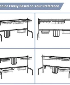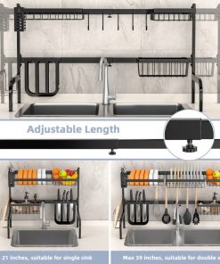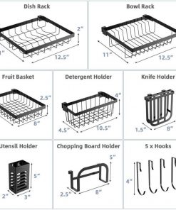 Perfectly fits single or double sinks with the adjustable length from 21″ to 39″. Over-the-sink design for saving space and auto water drainage. 4 baskets, chopping board and utensil and knife holder and 5 hooks meet any sink storage needs. Anti-rust steel for great sturdiness and durability. Convenient to assemble with clear instruction and complete accessories.