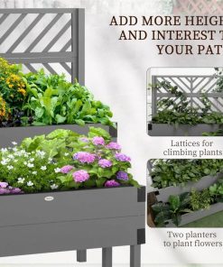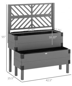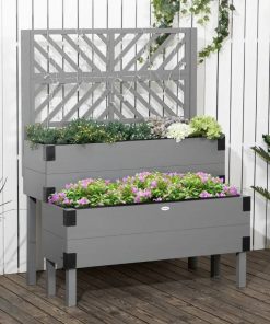 Grow BIG at home with this 2 Tier Grey Lattice Trellis Self Draining Wooden Garden Raised Planter Box! This garden bed kit offers 2 troughs so you have extra space to organize and plant. The raised design keeps plants up and away from weeds and wild animals while keeping you from bending and stooping, which could lead to back strain. The back wall of our vegetable garden bed doesn’t just offer decorative flair, it also helps support climbing plants, and offers a space for you to hang plant pots. The corners of each raised garden box are reinforced with metal brackets. Combined with a solid wood frame, these brackets help them hold more soil and provide a more robust resistance to weather conditions. The bottom of each box offers a water draining hole protected with nonwoven fabric. This combination prevents plants from waterlogging by draining out excess water without risking soil erosion.