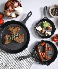 Cast iron pans are essentials in any kitchen. This 3-Piece Cast Iron Cookware Set with 8-inch 6-inch and 10-inch Skillet Frying Pan can sear, sauté, panfry, bake, broil, roast and more with these versatile and durable pans. Made from heavy-duty cast iron, preseasoned and ready to use; cast-iron releases food easily and its nonstick abilities will only improve over time. Sturdy integrated handles and pour spouts offer convenience and safer handling so you can use these pans confidently to make delicious meals. Their thick metal construction retains and distributes heat extremely well so they can avoid hotspots that burn food and cook more efficiently. They’re easy to maintain with occasional handwashing and reapplying with oil. The 3 piece set includes a suite of sizes for any recipe, 6inch, 8inch, 10inch pans. Make this set of durable versatile cast iron skillets a part of your cooking toolbox and cook perfectly browned delicious meals with ease.