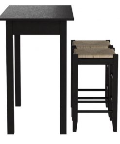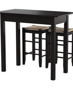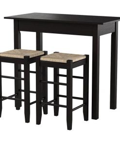 This 3 Piece Espresso Dining Set with Table and 2 Backless Stools has space saving convenience. This set features a simple rectangular table on long sturdy legs with two backless counter height stools with rush seats. Made from solid woods and MDF, and topped off with a rich Espresso finish. Stools tuck neatly under the table when not in use.