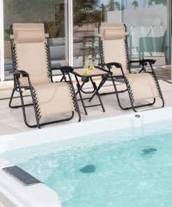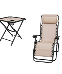 Bring the party with you anywhere this summer with this 3 Piece Folding Portable Reclining Lounge Chairs Table Set Tan. The breathable fabric keeps you cool even during hot summer days. Waterproof and sun resistant performance makes it the best for any outdoor occasion . This practical folding table in this set lets you place drinks and snacks on it and 2 mesh cup holders prevent any spilling. Ergonomic Tilt System and Practical Table. This zero-gravity chair is upgraded with a reclining locking system operated through a rotary knob.