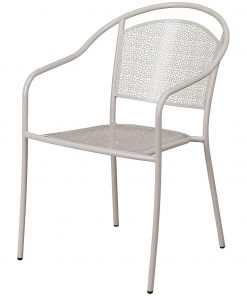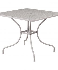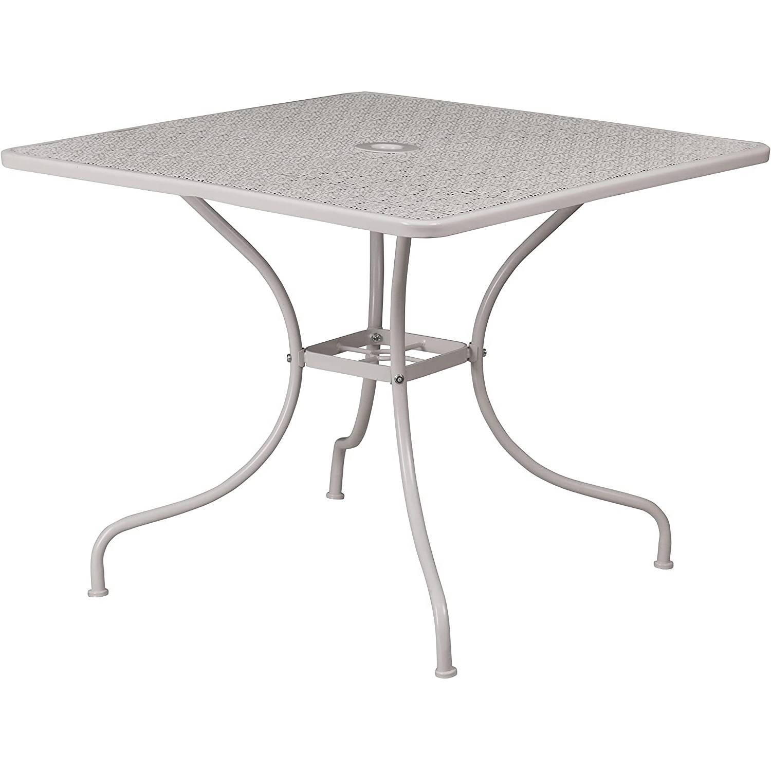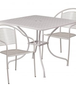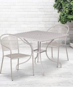 Brighten up your patio space with this Grey Steel Metal 3-Piece Outdoor Patio Furniture Set. This colorful set will enhance your bistro, cafe, restaurant, hotel or home patio space. The top includes an umbrella hole (umbrella not included). The patio chairs stack for storing. The frames are designed for all-weather use making it a great option for indoor and outdoor settings. For longevity, care should be taken to protect from long periods of wet weather. The possibilities are endless with the multitude of environments in which you can use this table, for both commercial and residential spaces.